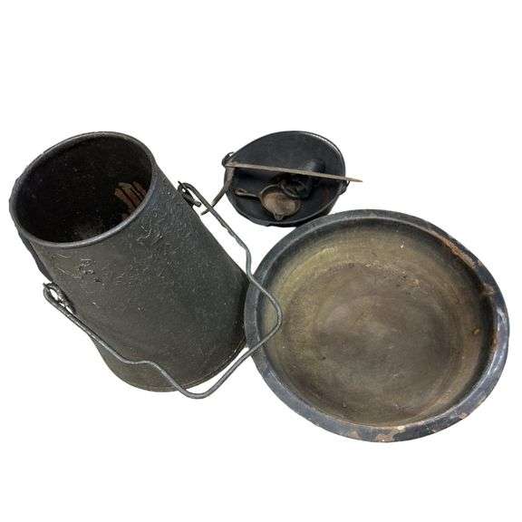 LOT 784 - Pickers LOT: Cast iron Huge Kettle Tea Water Campfire + Basins Bowls Scythe