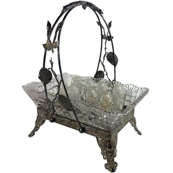 LOT 399 - Victorian American Brilliant Period Cut Glass Basket & Silver Plated Frame & 8 Salt Pepper Shakers