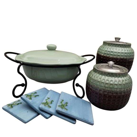 LOT 83 - BP Covered Casserole Rack Pottery Barn Frog Coasters Table Top Torches