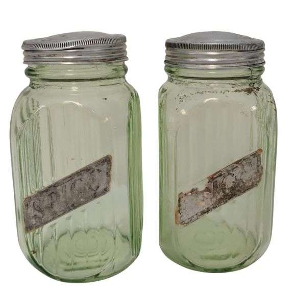 LOT 100 - 2 Uranium Glass Green Vaseline Hoosier Cabinet Spice Jars Indiana