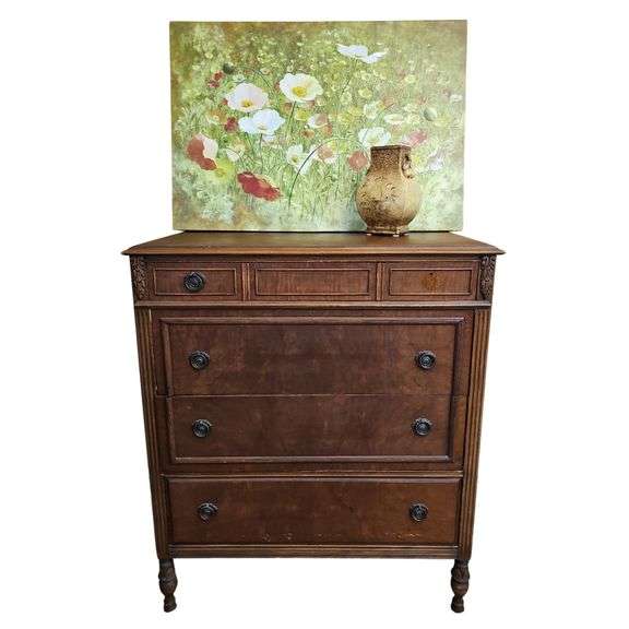 LOT 30 - Antique Triangle Brand Tall Boy Dresser 3ft Poppy Painting + Vase