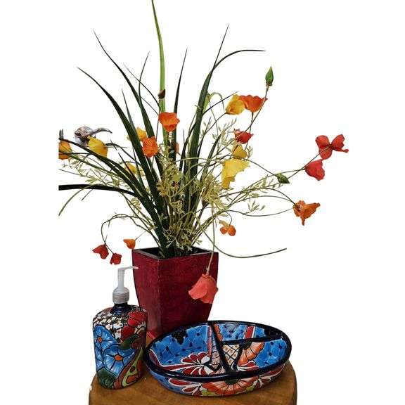 LOT 38 - LOT Hand Painted in Mexico Colorful Dish Soap Pump & Faux Poppy Plant