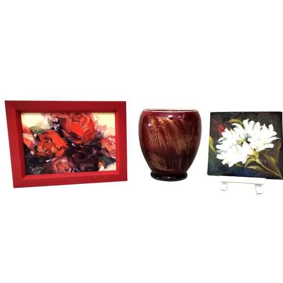 LOT 63 - Two Mini Original Floral Paintings & Candle