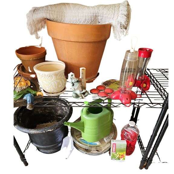 LOT 100 - Outdoor Garden Decor Gnome Planters Watering Can SHELVES NOT INCLUDED!!