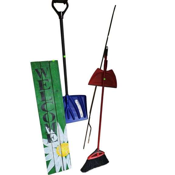 LOT 123 - LOT Porch Welcome Sign Shepherds Hook Shovel Broom