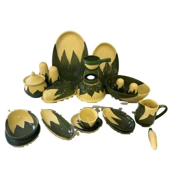 LOT 58 - Vintage Shawnee Pottery Corn Queen Platters Creamer Sugar Mixing Bowl Lot Dark Green