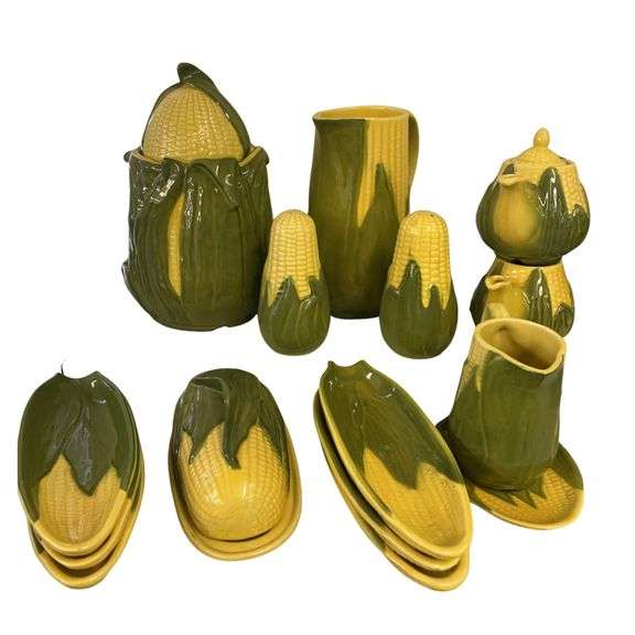 LOT 60 - Vintage Shawnee Corn King Canister Cookie Jar Pitcher S/P Mini Tea Corn Husk Plates Medium Green