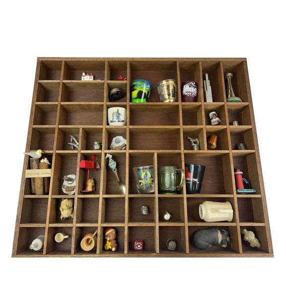 LOT 64 - Typesetters Tray Souvenirs Thimbles Space Needle Sears Tower Animals