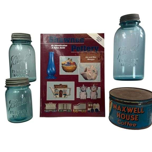 LOT 68 - 3 Vintage Blue Ball Jars Slope Shoulder Galvanized Lids + Maxwell House Shawnee Book