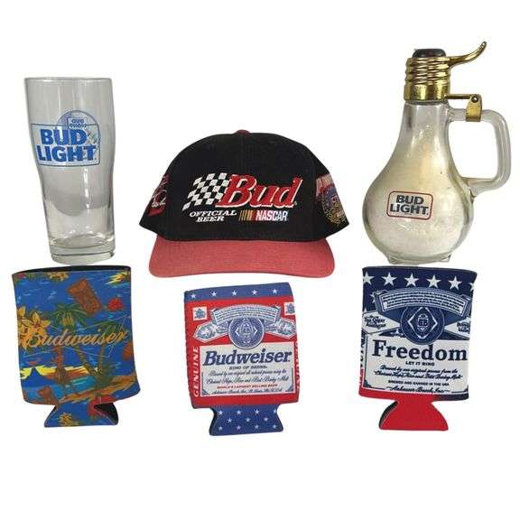 LOT 83 - Bud Light Bar Glass Light Bulb Stein Decanter Koozies NASCAR Hat