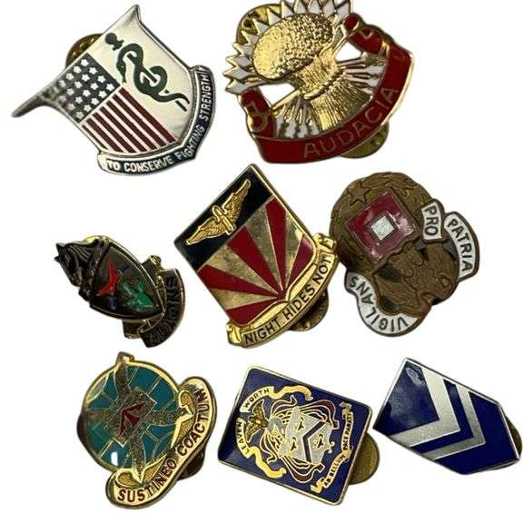 LOT 115 - 10 Military Pins Enameled Utmost of Power Audacia Vigilans Night Hides Not Wisdom Leavenworth Servin