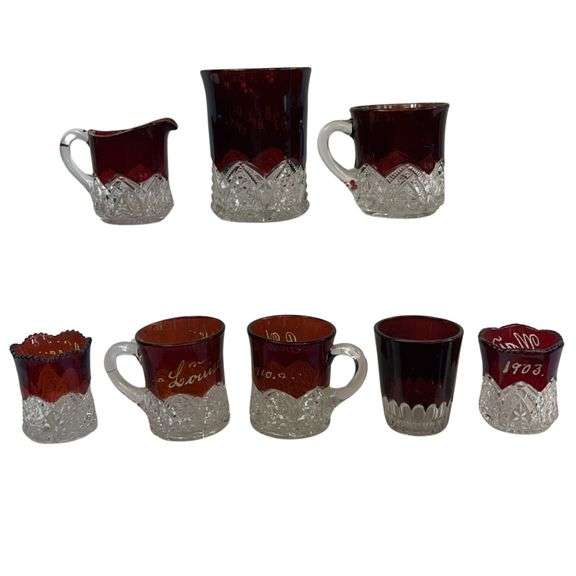 LOT 133 - Antique Ruby Flash Glass Cut to Clear Souvenir Cups 1910 1914 Gothic Decor