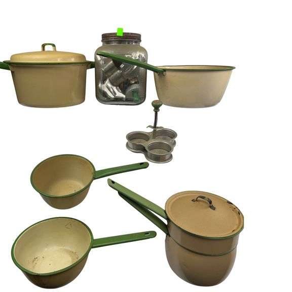 LOT 139 - Green Lid Jar Cookie Cutters Enamelware Tan Green Pots and Pans