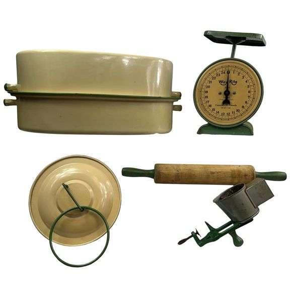 LOT 142 - Green Handle Rolling Pin Tan Enamelware Cover Roaster Repro Towel Ring
