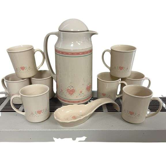 LOT 158 - Vintage Corning Ware Forever Yours Thermal Coffee Tea Pot Carafe + 8 Mugs Spoon Rest Pink Hearts