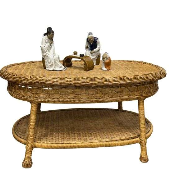 LOT 159 - Antique Wicker Coffee Table Boho Decor Good Condition + Mudmen Figures