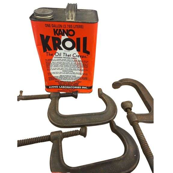 LOT 248 - 3 Antique Vintage Cast Iron C Clamps Williams 404 Armstrong + Kano KROLL Oil Can